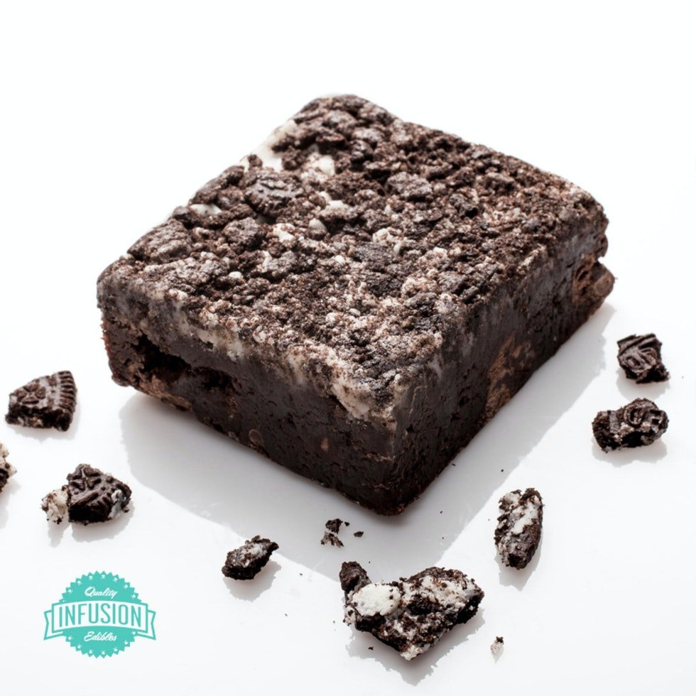Buy Cookies N Cream Brownie 100mg UK Online. A fudge brownie featuring a top layer of cream frosting blended with chocolate cookie crumbles. 100mg THC.